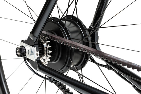 Running on a Gates Carbon belt drive, this is a single speed bike with a rear hub torque sensor. As soon as pressure is applied to the pedals, you're off!